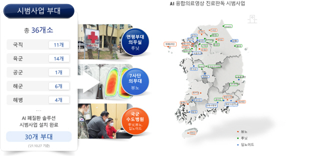 국방부와 과기정통부는 '디지털 뉴딜' 사업인 AI 융합 프로젝트(AI+X) 일환으로 2020년 7월 인공지능 솔루션 개발에 착수했다. 군이 보유한 엑스레이·CT(컴퓨터단층촬영) 등 의료데이터를 AI가 분석해 진단을 지원하는 기술이다. 2020년부터 2023년까지 332억원이 투입돼 군에서 발생위험이 높은 6대 질환을 대상으로한 솔루션이 개발된다. 향후 적용 질환 범위는 확대될 예정이다.