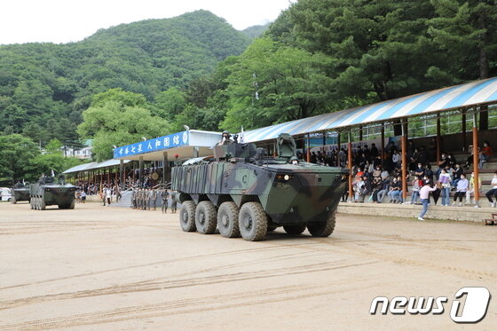 2년6개월 만에 대면 행사로 진행된 육군 7사단 수료식에서 차륜형장갑차가 기동하고 있다.(육군 7사단 제공) 2022.6.15/뉴스1